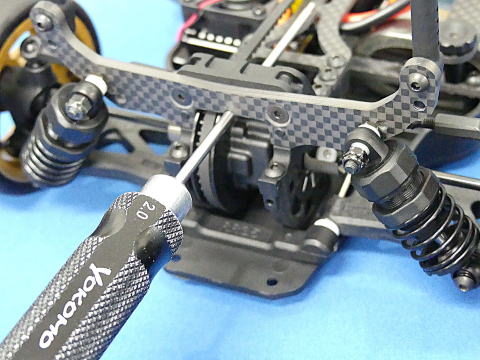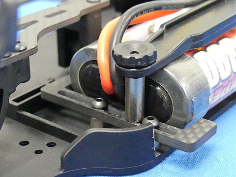 マシンの重心位置や、左右タイヤの面圧をセッティングするのに便利な窪みをダンパーステーにデザインしてあります。