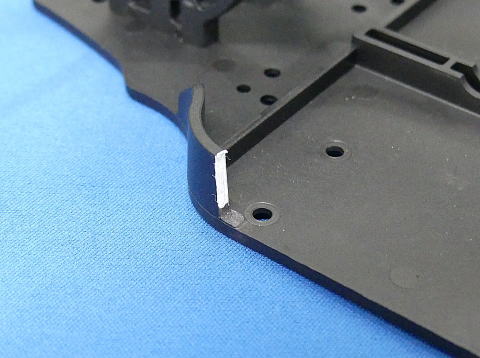 シャーシを、2ミリ程ニッパー等でカットします。(白い部分です)